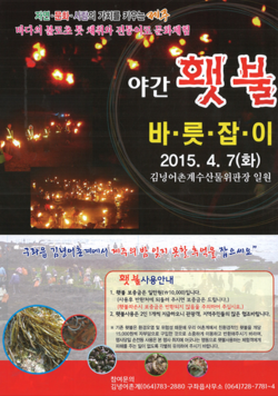 이 행사는 김녕어촌계 주관으로, 오는 4월 7일 12시 반부터 오후 8시 반까지 김녕리 해안도로변에 위치한 수산물 위판장 및 “목지코지”어장에서 도민과 관광객을 대상으로 전통 어로문화 체험기회를 제공하기 위한 톳어장 개방 및 바닷가 보물찾기 등 “추억의 야간 횃불 바릇잡이”가 행하고 있다.