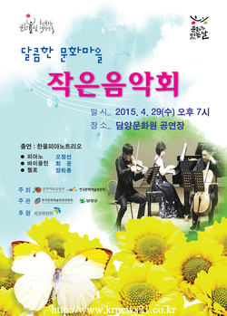 담양군이 봄의 향연을 흠뻑 느낄 수 있는 음악회를 마련해 눈길을 끈다. 군에 따르면 4월 문화가 있는 날을 맞아 오는 29일 저녁 7시 담양문화원에서 ‘달콤한 문화마을-작은음악회’에 한울피아노트리오를 초청해 기악 합주 공연을 펼친다.