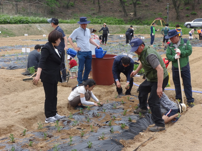 양주시농업기술센터는 올해 6월 준공 목표로 조성중인 농촌테마공원 내에 8,500㎡ 규모의 주말농원을 지난 3월 구좌(약 23㎡)당 5만원에 분양공고하여 공무원 13구좌, 어린이집 15구좌, 도시민 52구좌 등 80구좌를 신청받아 멀리 서울지역 분양자 3가족 15명 등 모두 200여명이 참여한 가운데 상추·고추·가지·토마토·땅콩 등 묘종을 심는 대성황을 이루었다.