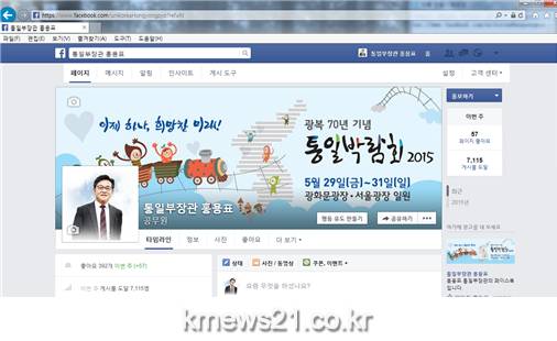 최근 홍 장관은 개인 계정을 운영 중인 페이스북을 통해 통일박람회 이벤트 계획을 공유했다. '통일박람회 2015' 일정과 주요 프로그램을 안내하고, 27일(수)까지 본 글을 공유하고 함께 홍보에 나선 누리꾼 중 5명을 선정할 예정이며, 30일(토) '통일박람회 2015' 주요 부스와 프로그램을 직접 안내할 계획이다.