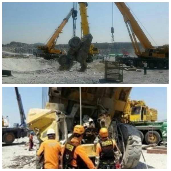 ▲ 31일 단양군 매포읍 우덕리의 한시멘트 채석장 수직갱도로 추락한 덤프트럭 김모씨를 시신을 인양작업하고 있다.
