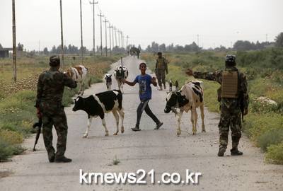 이라크 북부 사예드 가리브의 도로에서 친정부 민병대원들이 IS로부터의 탈환 후 도로를 지키고 있다.