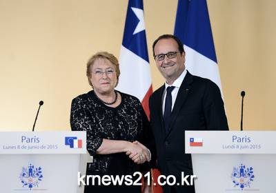 프랑스 엘리제 궁에서 칠레 미첼 바첼레트 대통령과 프랑스의 프랑수와 올랑드 대통령이 공동 서명을 하는 동안 악수를 하고 있다.