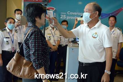 ▲ 캄보디아 프놈펜 국제 공항에서 메르스로 인한 체온 확인 작업이 진행되고 있다. ⓒAFP 캄보디아의 맘 분행 보건부 장관이 캄보디아 프논펜 국제 공항에서 승객의 체온을 확인하고 있다.