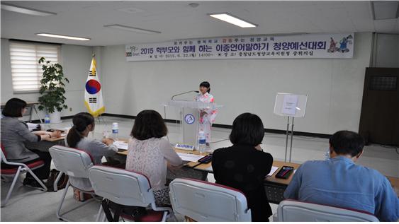 충청남도청양교육지원청(교육장 김은자)은 22일 중회의실에서 다문화학생의 꿈과 끼를 키우고 이중 언어 재능을 조기에 발굴‧신장하기 위하여,‘2015 학부모와 함께하는 이중 언어 말하기 대회’를 개최하였다.
