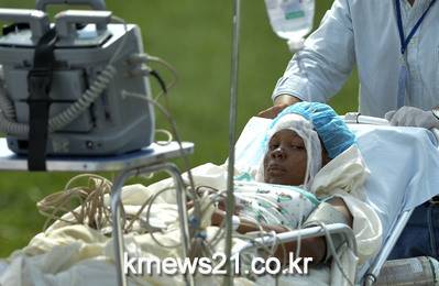 ▲ 콜롬비아서 비행기 추락 후 5일만에 발견된 여성이 병원으로 후송되고 있다. ⓒAFP콜롬비아 올라야 에레라 공항에 콜롬비아 정글에 떨어진 비행기 추락이후 5일만에 구조된 한 여성이 도착했다.