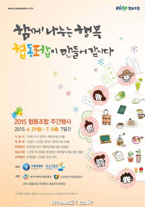 7월 4일 ‘협동조합의 날’을 맞이하여, 협동조합과 관련기관과의 상호 교류와 협력을 이끌어내고, 국민과 함께 협동조합에 대한 이해와 활동 가치를 공유하기 위한 <2015 협동조합 주간행사>가 ‘함께 나누는 행복, 협동조합이 만들어갑니다’란 주제로 지난 6월 29일(월)부터 7월 5일(일)까지 진행되고 있다.