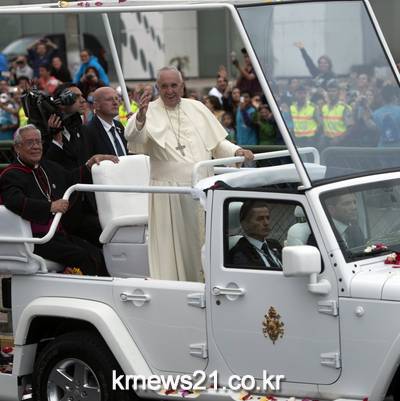 ▲ 프란치스코 교황이 에콰도르를 방문했다. ⓒAFP프란치스코 교황이 에콰도르를 방문해 수도 키토의 거리를 지나며 인사를 하고 있다.
