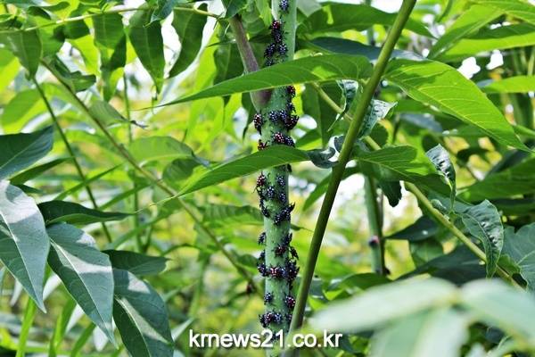 정읍시농업기술센터(소장 김원봉)은 최근 과수 돌발해충 예찰을 실시한 결과 포도과원 주변 야산 가죽나무에 꽃매미 약충 밀도가 평년보다 높아 중점 방제가 필요하다며 주의를 당부했다.금번 과수원과 주변야산에서 돌발해충 2차 약충조사를 실시한 결과 갈색날개매미충, 미국선녀벌레 등 2개 해충은 현재 까지 관찰되지 않고 있으나, 2010년부터 포도과원 전체에 발생되었던 꽃매미 약충이 이번조사 결과 과원 주변 야산이나 도로 주변 가죽나무에서 발견되었다.