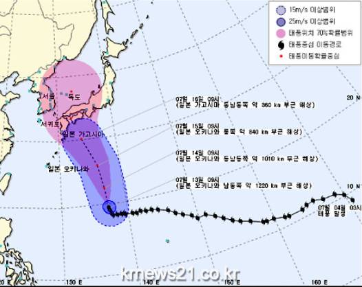 오는 16일 오전 3시에는 일본 가고시마 동남동쪽 460㎞ 인근 해상까지 접근할 것으로 예상되며 이번 주말 독도를 비롯한 동해안, 남해안을 중심으로 한반도에 영향을 미칠 것으로 보인다