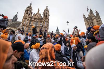영국 런던의 국회의사장앞에서 인도의 정치범 석방을 요구하는 인도의 시크교 시위대가 시위를 벌이고 있다.