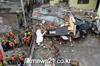 ▲ 인도 뉴델리에서 부실한 4층 다가구주택 붕괴로 4명이 숨졌다. ⓒAFP인도 뉴델리에서 국가재난대응군 NDRF과 기타 관계자들이 건물 잔해 수거 작업을 하고 있다.