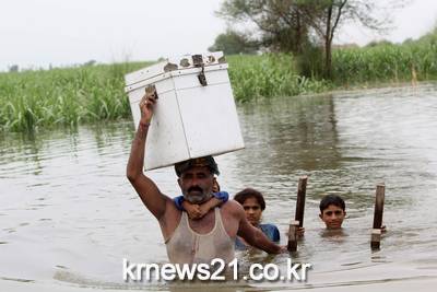 파키스탄 푼자브주에서 홍수로 인해 244 곳의 마을이 피해를 입어 한 가족이 최소한의 생계물품을 가지고 인근 마을로 대피를 가고 있다.