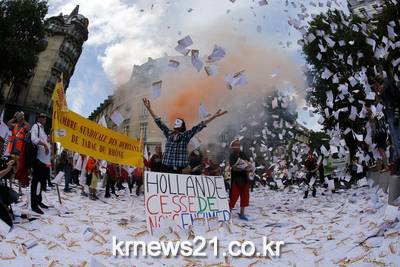 프랑스 파리에서 마스크를 쓴 시위자가 담뱃값 정책에 반대하는 탄원서를 뿌리며 시위를 벌이고 있다.