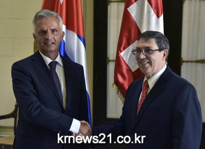 스위스 외무장관 디디에 부르크할터와 쿠바 외무장관 브루노 로드리게스가 쿠바 하바나에 위치한 외교부에서 회담 전 악수를 하며 사진을 찍고 있다.