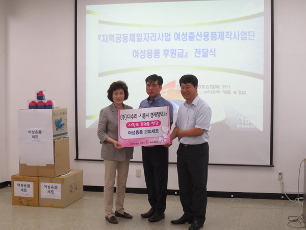 시흥시 종합일자리센터에서는 후원기업인 ㈜다수리가 지역사회의 어려운 이웃을 위하여 시에서 운영중인 여성출산용품제작사업단이 제작한 여성용품(면생리대) 200세트(2백만원)를 구입하여 1%복지재단에 기부하는 나눔의 행사를 지난 8월 13일 가졌다.