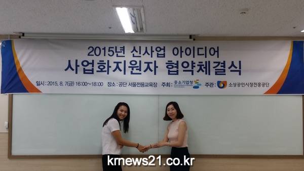의정부시(시장 안병용)에서 운영중인 1인창조기업 비즈니스센터·시니어 기술창업센터에 입주한 예비창업자(함진주)는 지난 7일 중소기업청과 소상공인진흥공단에서 실시한 2015년 신사업 아이디어 사업화 지원사업에 선정되어 사업화 자금지원 협약을 체결했다.