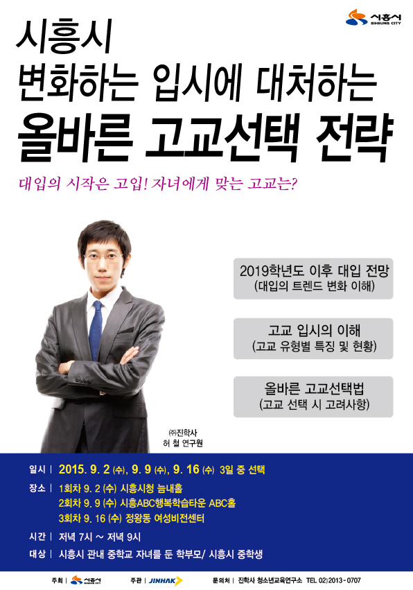 시흥시가 적성검사 및 진로지도사업의 일환으로 입시전문교육기관인 (주)진학사와 함께 자녀의 진학준비에 고민이 많은 시흥시 학부모를 위해 9월 2일부터 3주간 매주 수요일 저녁 7시부터 9시까지 2016학년도 고교 선택 전략 설명회를 개최한다.