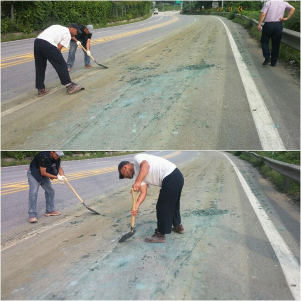 31일 오후 2시30분께 충북 제천시 대량동 현대시멘트 부근 국도 5호선에서 25톤 대형트럭의 잠금부분이 풀리면서 실고 있던 산업폐기물인 동제 슬러그가 도로에 쏟아져 인력이 동원돼 긴급 방제에 나섰다.