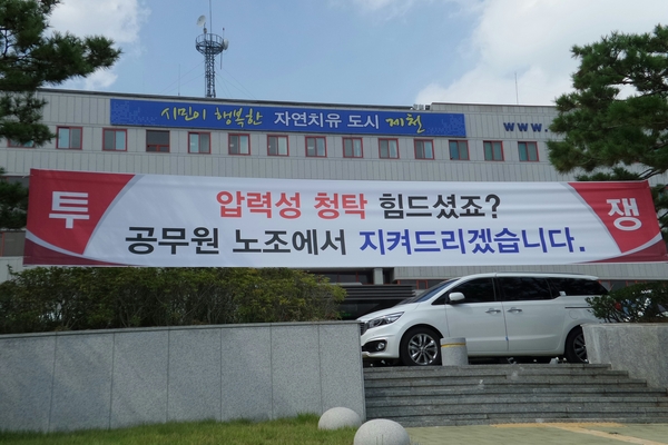▲ 제천시공무원노조가 시청 청사앞에 내걸은 현수막.제천시 공무원노조는 "지난 1월 22일 성명중 의장과 간담회를 갖고 보복성 과다 자료요청과 시 집행부 공무원 대상 청탁을 근절하겠다고 약속했음에도 성의장은 담당공무원에게 자신이 운영하는 업체가 일을 맡도록 하고 관급공사 하도급을 특정인에게 주도록 압력을 행사하는 등 신뢰를 저버린 말뿐인 약속했다"고 주장했다.
