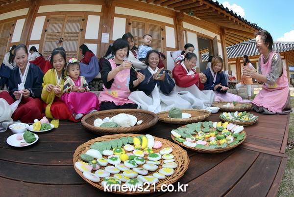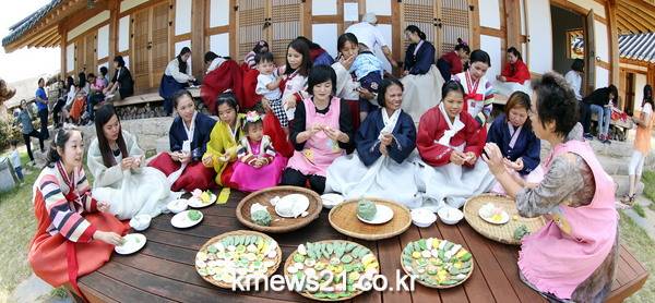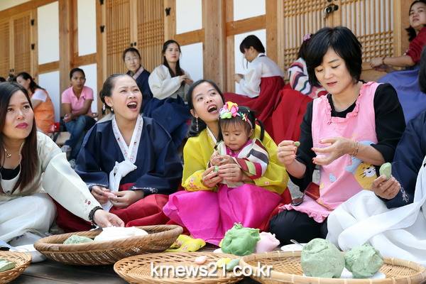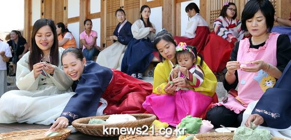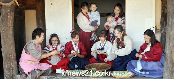 추석명절을 닷새 앞둔 지난 22일 결혼이민자 여성을 위해 전남 강진군 다문화가족지원센터가 마련한 한국명절문화체험에 참가한 이주여성들이 강진읍 동성리에 자리한 사의재(四宜 齋) 한옥 체험관에서 곱게 차려입은 한복만큼이나 환한 모습으로 송편 빚기에 여념이 없다.
