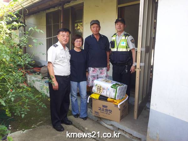 안성경찰서(서장 서상귀)는 ’15. 9. 21(월) 14:00 일죽파출소장 양강열 등 직원 5명은 다가오는 추석을 맞아 우리 사회의 관심이 필요한 이웃들에게 훈훈한 사랑의 온정을 전달키 위해 일죽면 주천리 거주 황OO, 월정리 거주 김OO 독거노인을 방문하여 각각 10만원 상당 도합 20만원 상당 위문품을 전달하였다.