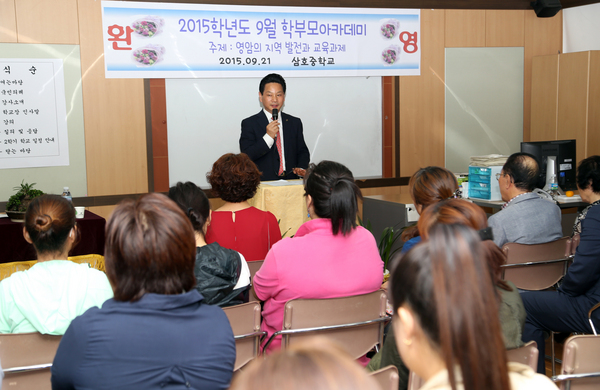 전동평 영암군수가 지난 21일 영암군 삼호읍 삼호중학교 도서실에서「영암의 지역발전과 교육과제」라는 주제로 학부모 아카데미 강연회에서 특강을 하였다.