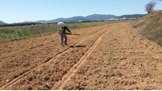 군은 경운작업을 실시하여 잡초를 없애고 흙을 골라낸 뒤 유채 250kg을 파종하고 비료주기 작업을 마쳤다.