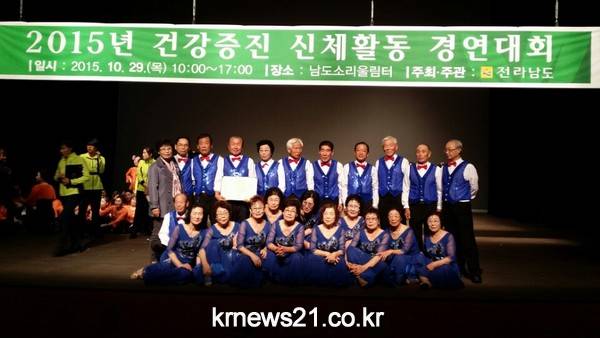 해남군(군수 박철환)은 지난 10월 29일 전남도 주최로 열린 ‘2015년 건강증진 신체활동 경연대회’에서 해남땅끝신바람팀이 참가, 2등인 우수상을 수상했다.