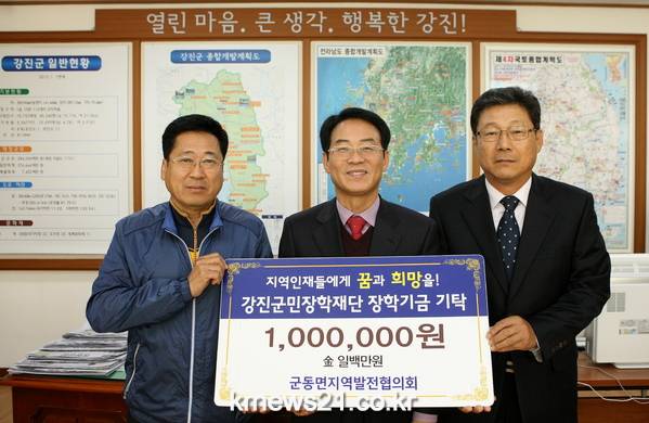 지난 2일 군동면지역발전협의회(회장 김현석), 마량놀토 미항 건어물(대표 이호현)에서 강진군민장학재단에 장학금 1백만 원씩 기탁했다.