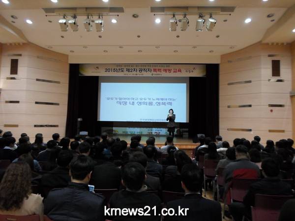 의정부시(시장 안병용)는 11월 23일 시청 대강당에 300여명을 대상으로2015년도 제2차 공직자 폭력예방교육을 실시했다.