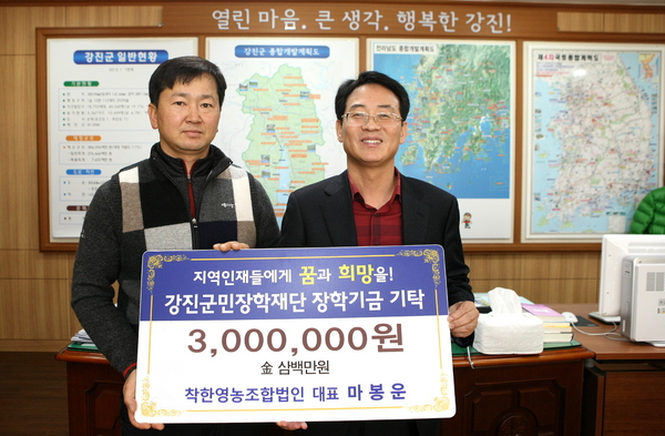 전남 강진군 옴천면에 소재한 착한영농조합법인(대표 마봉운)에서 1일 강진군민장학재단(이사장 강진원)에 장학기금 3백만 원을 기탁했다.