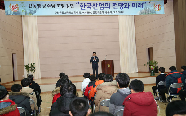전동평 영암군수는 지난 3일 「한국산업의 전망과 미래」에 대해 구림공고 학생들을 대상으로 열띤 특강을 펼쳤다. 1시간동안 펼쳐진 이 자리는 한옥건축학과 개편 후 성공적으로 2016년 첫 신입생 유치를 축하하고 앞으로 인재로 거듭날 구림공고 학생들을 위한 자리였다.