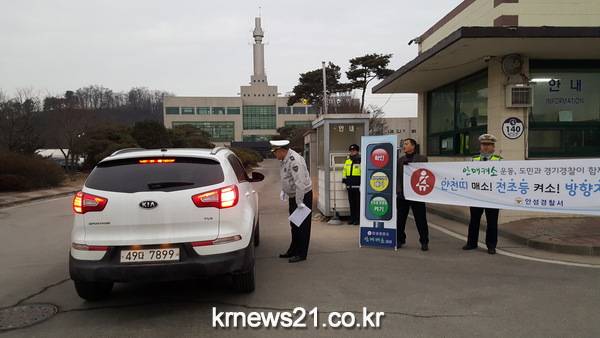 안성경찰서(서장 서상귀) 교통관리계(과장 경감 유병일)에서는 2016. 2. 01. 07:30~08:30분 경찰서 정문 앞에서 교통문화정착을 위한 “안전띠 매기, 주간 전조등·방향지시등 켜기를 통한 교통소통 확보”를 목표로 추진 중인 안매켜소 운동 확산을 위해 교통기능 경찰 간부들의 솔선 캠페인 실시