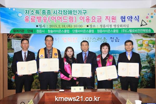 이날 김생기시장과 윤광호 청솔라이온스클럽회장과 전미경 단풍라이온스클럽 회장, 김경섭 정읍라이온스클럽 회장, 정영식 CJ헬로비전 전북방송대표는 협약서에 서명하고,   대상 가구에 대한 제반 시설 설치 및 이용요금을 지원하기로 했다.