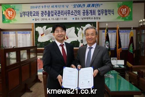 조성수 남부대학교 총장과 김상진 광주출입국관리사무소 소장은 지난 15일 교내 총장실에서 9주년 세계인의 날 ‘웃어라 세계인’ 기념행사 공동개최에 관한 업무협약을 체결했다.