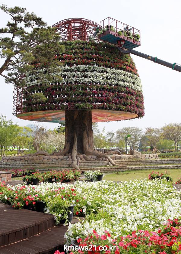 29일 개막하는 제18회 함평나비대축제를 앞둔 22일 함평엑스포공원에 대형 꽃탑 설치가 한창이다.