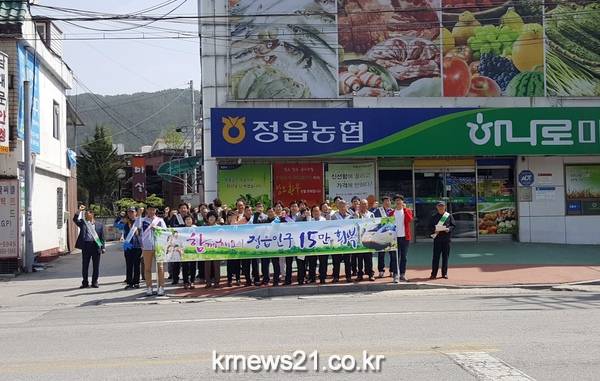 캠페인에 참여한 도병주 통장협의회장은 “한 때는 28만에 이르렀던 정읍시 인구가 12만 밑으로 떨어졌다는 점에 격세지감을 느낀다. 우선 나부터 정읍인구 15만 회복을 위해 주민홍보에 적극 나서 인구 늘리기에 보탬이 되겠다.”고 말했다.