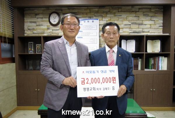 정읍영생교회 김재조목사가 지난 16일 이웃돕기 성금 200만원을 초산동 주민센터에 기탁했다.