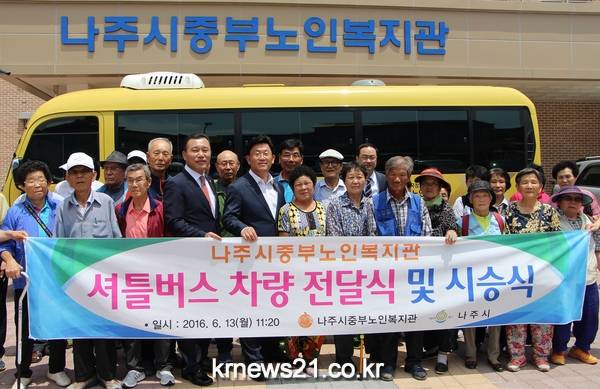 시는 13일 나주시중부노인복지관에 25인승 셔틀버스 차량을 전달, 교통이 불편해서 복지관 이용에 어려움을 겪고 있는 어르신들의 원활한 교통편의를 지원했다.