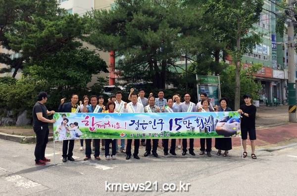 시기동주민센터는 지난 28일 ‘주민참여예산제 지역회의’후 참여자 및 직원 20여 명이 참여한 가운데 ‘함께해요! 정읍 인구 15만 회복’ 캠페인을 전개했다.
