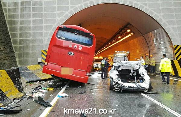 차량 정체로 서행 중이던 이들이 탄 K5 승용차를 뒤따르던 관광버스가 달리던 속도 그대로 들이받았다.