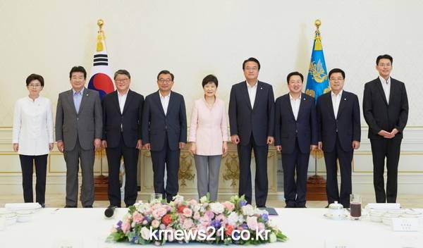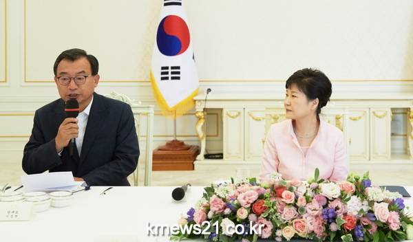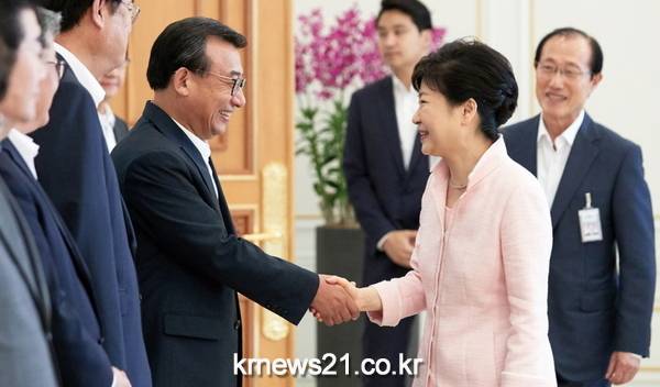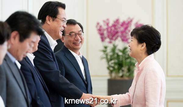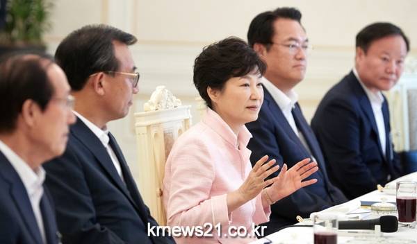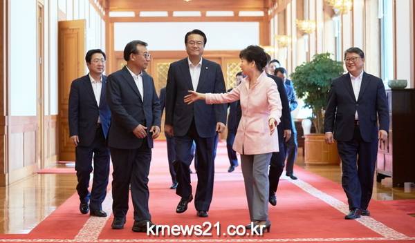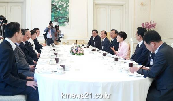박근혜 대통령이 11일 오후 청와대에서 열린 새누리당 신임 지도부 오찬에 참석하고 있다.