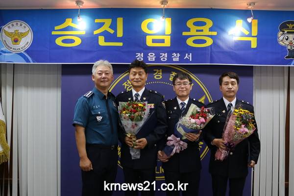 정읍경찰서(서장 김주원)는 지난 1일 2층 어울마당에서 경위로 승진하는 손범수 경사, 이해동 경사, 권대철 경사의 승진임용식을 개최했다.