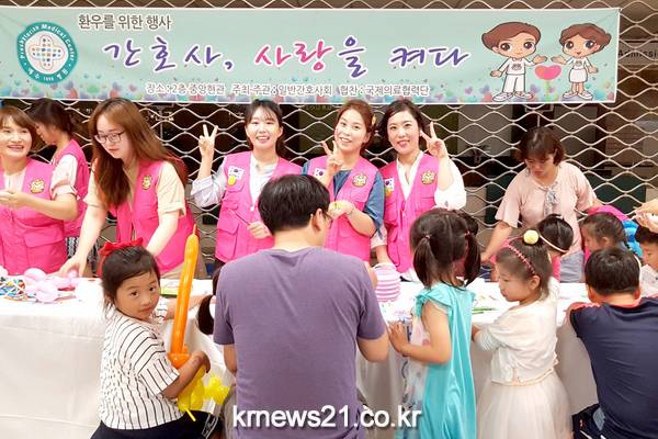 ▲ 간호사, 사랑을 켜다전주 예수병원 간호사들은 간호사 유니폼 대신에 일상복을 차림으로 평소에 환자와 만나는 병상을 벗어난 곳에서 환우와 보호자과 가벼운 마음으로 소통하며 즐거운 시간을 가졌다. 이 행사에 참여한 예수병원 간호사 20명은 풍선아트, 페이스 페인팅, 찐빵 나누기 등을 통해 환자들과 따뜻한 사랑을 전했다. 아이들은 풍선이 강아지가 되고 칼과 왕관으로 바뀌는 것을 보며 기뻐했고 환우들에게 따뜻한 찐빵을 선물하며 즐거움을 함께 했다.