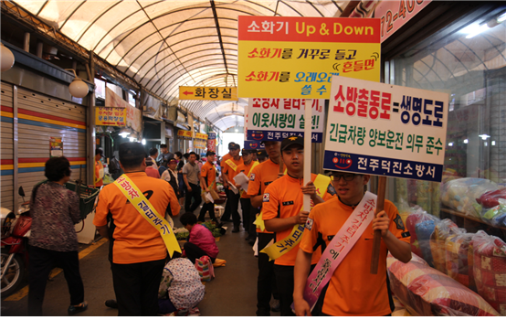 소방출동로 = 생명로’라는 구호 아래 전통시장 주변 가두 캠페인을 진행하면서 불법 주정차 차량을 이동조치하고 소방 긴급출동에 장애가 되는 상가진열 좌판 등을 제거토록 지도하였다.강원석 전주덕진소방서장은 “전통시장은 소규모 상가가 밀집해 있어 화재 시 급격한 연소 확대가 우려될 뿐만 아니라, 평소 상가의 진열 좌판으로 소방통로가 협소하여 신속한 출동이 매우 어려운 실정”이라며 도민의 안전을 위해 출동에 지장이 있는 진열좌판은 반드시 제거해 달라”며 거듭 당부하였다.