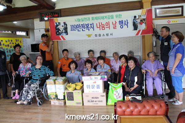 정읍소방서(서장 김일선)는 12일 추석 명절을 맞이하여 정읍시 장명동 소재 품안애 요양시설에서 119안전복지 나눔의 날 행사를 가졌다.