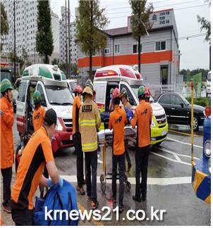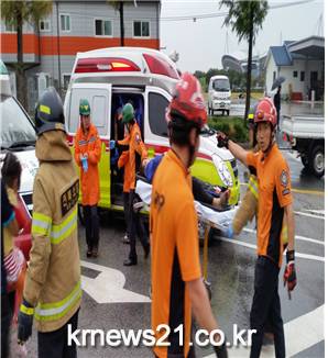 사고내용 및 구조내용 출동한 전주덕진소방서 구조대는 17:18분경 현장 도착하여 확인한바 차고지에서 후진하던 대형 견인차량이 횡단보도에 서 있는 요구조자 김평순(여,72세)씨 외 2명을 치어 김평순씨는 차량 밑에 깔려 있는 상태로 구조대는 에어백 이용 자체를 들여올려 차 밑에 있는 요구조자를 구조 후 팔복구급차 1명, 삼례구급 2명을 인계, 생체징후 체크 및 골절부위 드레싱 후 부목고정 및 수액을 공급하면서 전북대학병원으로 신속히 이송 함