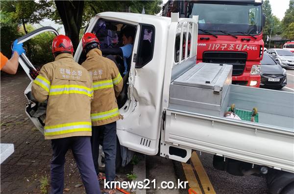 사고내용 : 상기장소 운행중이던 1톤포터차량과 경찰순찰차, 투산차량이 상호 충돌한 3중 교통사고임 구조내용 : 출동한 전주덕진소방서 구조대는 현장 도착한바 1톤포터 차량운전자가 차체에 끼어 나오지 못하는 상황에서 유압장비 이용 운전석쪽 차문을 개방하여 운전자를 안전구조 구급대에 인계 병원 이송조치함 조치사항(시간별) 07:12 현장도착 07:30 1톤 포터 요구조자 유압장비 이용 안전구조 07:40 교통사고 현장 2차사고 방지 교통통제 및 정리함