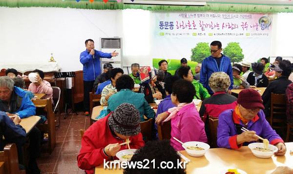 여수시 동문동 주민센터는 지난 27일 동문교회에서 지역 주민 300여명을 초청해 ‘사랑의 국수’ 나눔 행사를 열었다.